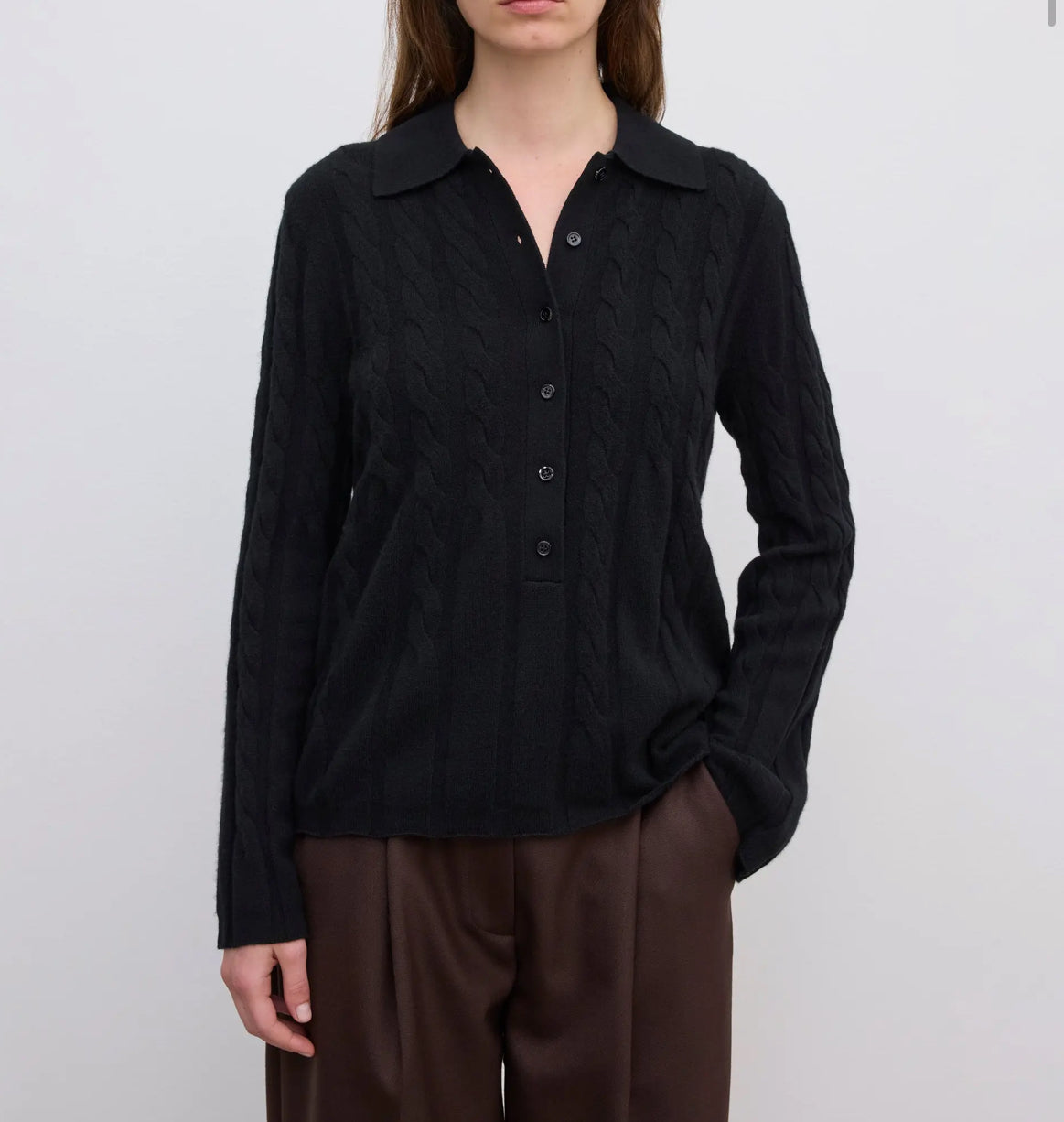 Polo knit sweater from a soft cashmere and wool blend with a relaxed frame and a dynamic cable knit pattern by Dagmar’s in-house knitting atelier.