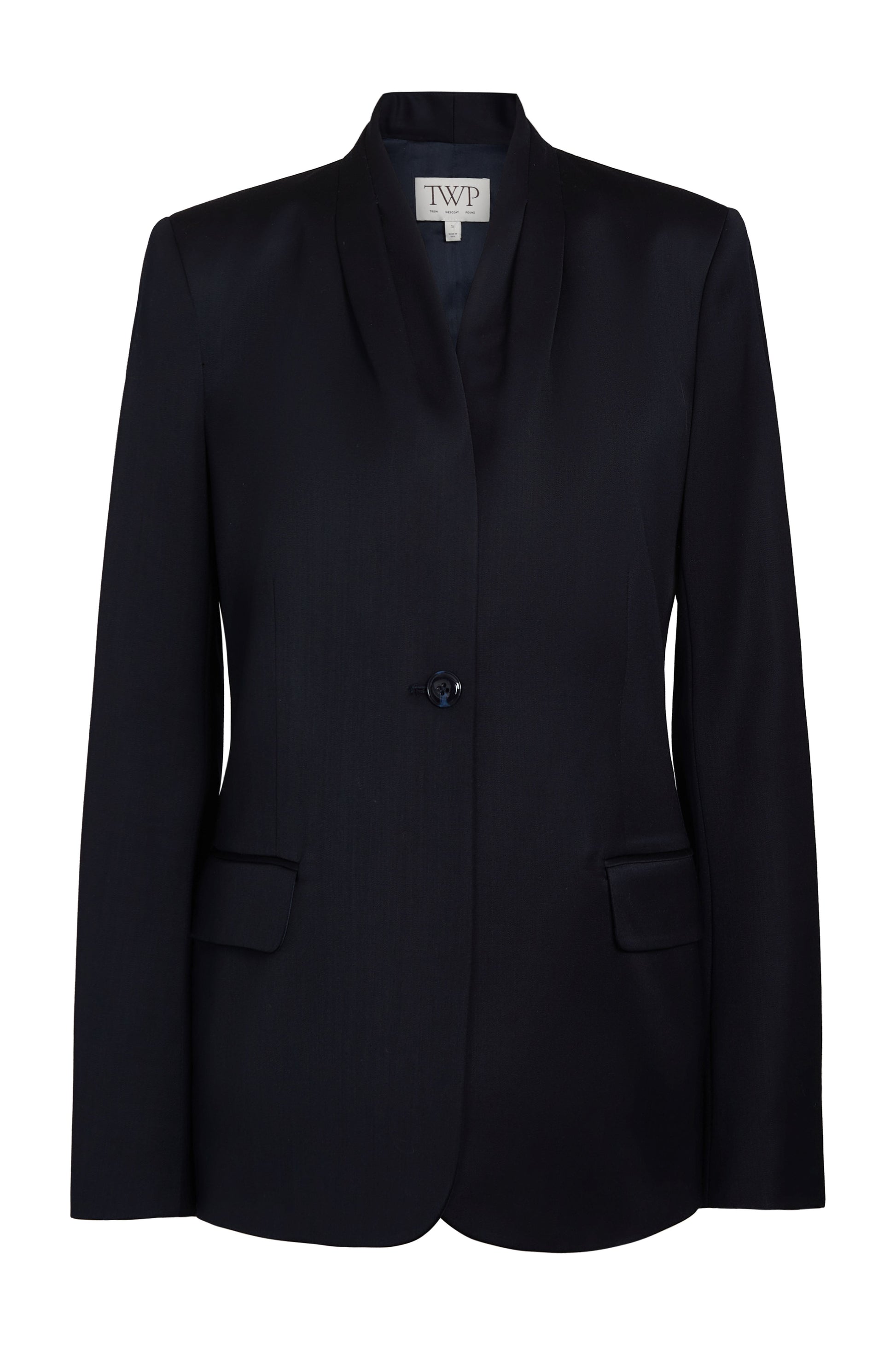 Oversized, collarless single breasted blazer in satin faced wool suiting. The New Dinner Jacket is a one-button blazer which drapes over the hips. Tailored with side darts, shoulder pads and pleats below the neckline. Complete with side flap pockets, single vent and button cuffs.