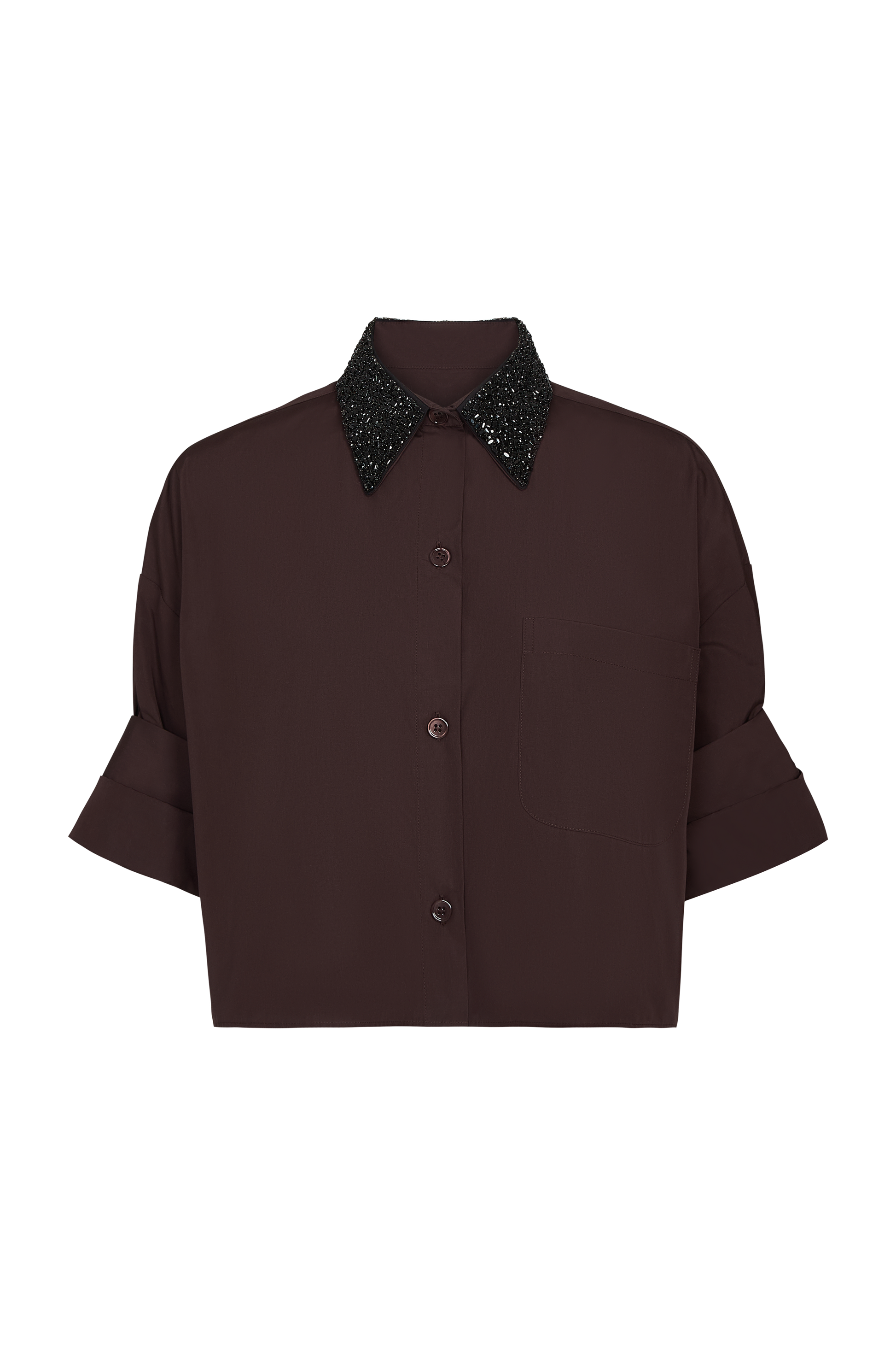 TWP’s signature short sleeve button down is crafted in superfine Italian cotton shirting and embellished with a sparkling prong set crystal collar. The Next Ex is a cropped, boxy silhouette complete with a chest patch pocket, button up placket, spread collar, and signature double roll button cuffs.